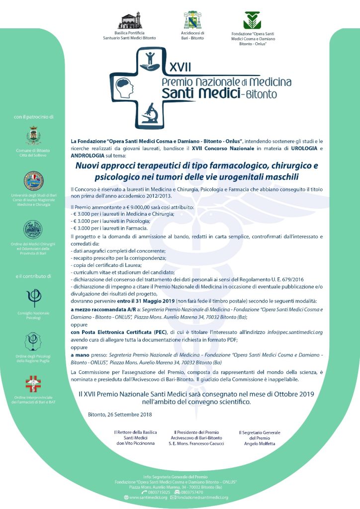 Pubblicato come da statuto nel giorno della Festa Liturgica dei Santi Medici Cosma e Damiano, il bando del XVII Premio Nazionale di Medicina Santi Medici in materia di #urologia e #andrologia. Il premio è rivolto a neo laureati in medicina e chirurgia, psicologia e farmacia.