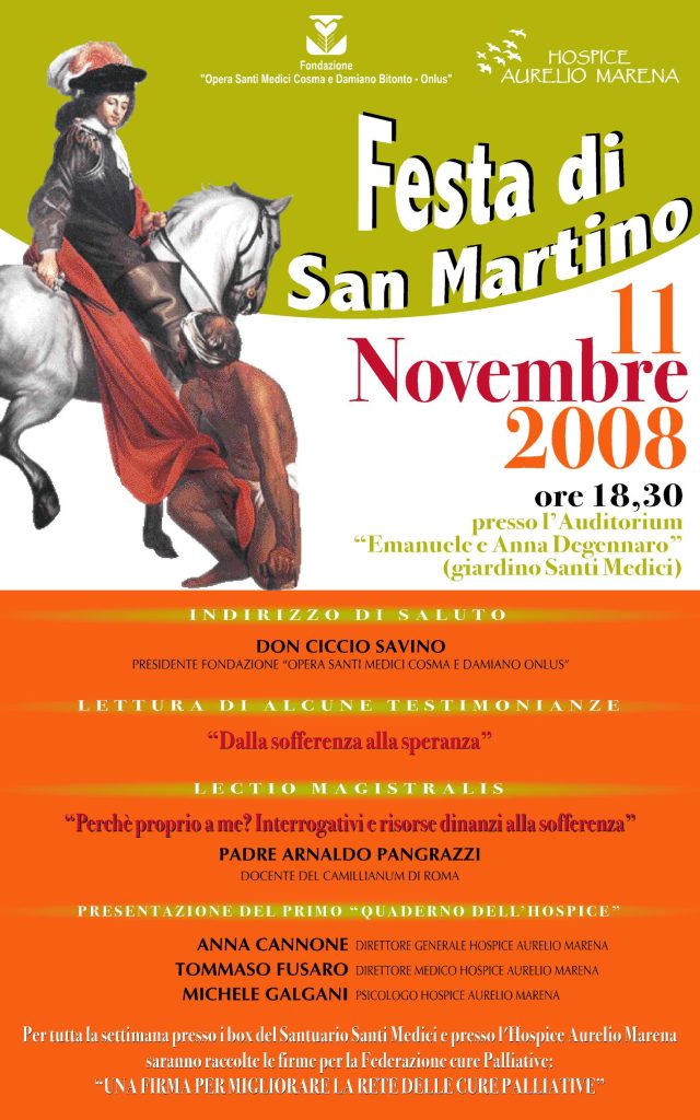 La data dell’11 novembre è stata scelta perché si riallaccia alla leggenda di Martino, giovane soldato di Pannonia, che più di 1.500 anni fa, per aiutare un vecchio sfinito dalla pioggia e dal freddo, gli offrì metà del suo mantello tagliandolo con la spada. Dopo quest’atto di spontanea generosità all’improvviso il tempo mutò, il cielo si schiarì e l’aria si fece incredibilmente mite: era nata l’ Estate di S. Martino. Il termine palliativo poi, ha la sua radice etimologica proprio nel latino “pallium”= mantello e il senso di coprire, avvolgere, proteggere (come in un mantello) è quello che più si avvicina al significato che si vuole attribuire al termine palliativo.